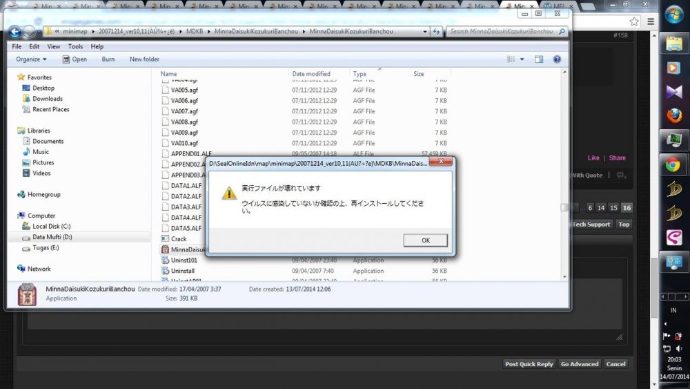 killerinsidee Posted March 25, 2013 Posted March 25, 2013 (edited) This funny little VN popped up out of nowhere and some people are having problems with running it properly (as usual), so here we go again. Issue #1: The error pop-up thing is annoying. --------------------------------------------- 1. Rename the game folder to TickTack. 2. Find Crack.exe (move it to the game folder if it's somewhere else) and rename it to TT_Remove_DRM.exe. 3. If you by have SYS3RK.BIN (1kb) in your game folder, delete it. You shouldn't have it prior to doing Step 4., but check just in case. 4. Download Download Remove DRM.bat from Sendspace.com - send big files the easy way and run it, you should see a message "1 file(s) moved" somewhere in the window if everything went well. Assuming that you didn't fail along the way, you should now have the file SYS3RK.BIN in your game folder and the annoying pop-up will stop. Note: You can't just download and copy SYS3RK.BIN to the game folder, it won't work. Update: Don't use this method, follow the instructions below instead. Since some people are having issues with the instructions above, so let's get rid of the renaming hassle. 1. Download http://www.sendspace.com/file/sphmr4. 2. Copy it inside the game folder and run it. You should see a message "1 file(s) moved" somewhere in the window if everything went well. Note: You don't need to rename anything. It will work if the "crack file" is called Crack.exe or if you already renamed it to TT_Remove_DRM.exe (as instructed before). Either will are fine. Also, the game folder name doesn't matter. Issue #2: Missing text/lines - If it looks like some lines are missing, try set the Message Speed to maximum. It should display them properly with that. Issue #3: Graphical glitches around the text - If you're getting this, that means that your system is not in Japanese locale (guides - XP, Win7). Applocale will not work. Not an Issue #4: I can't figure out how to save - Go to the bottom of the screen with the mouse cursor. Not an Issue #5: I can't figure out how to switch to windowed mode - Here's a picture of it. (F)= Fullscreen, (W)=Windowed. Issue #6: The game freezes / can't access the top menu - This seems to happen only in fullscreen mode for some people, so you need to switch to windowed mode. If you can access the top menu without freezing - check out Issue #5. If you can't - go to C:\Users\-username-\AppData\Local\Anastasia\... and find SYS3REG.INI. Open it and change ScreenMode from 0 to 1. The game will start in windowed mode the next time you run it and the freezing should be gone. Not an Issue #7: I can't figure out how to disable "Fade BGM while voices are playing" - This is turned on by default, but you may want to turn it off if it bothers you. The problem is that the BGM volume fades stays faded during whole conversations and not voiced lines only, like it would in other VNs where this option is present. It returns back to normal only briefly during scene transitions and occasional lines. This option is not present in the Settings menu, so you need to go to HERE and then un-check THIS. It disables the BGM fading. Issue #8: The game won't launch / Crack.exe crashes - You need to disable Data Execution Prevention for MinnaDaisukiKozukuriBanchou.exe, details on how to do it HERE. Do the same for Crack.exe if you're having problems with it crashing. Issue #8: Crash near the end of the game (at the ending video) - The video near the end of the game crashes because you don't have the proper codec installed to play it. Install K-Lite or CCCP codec packs. Just install one of them, either will work fine. Issue #9: Game crashes when saving - Weird letters like ê or ö in your Windows username are known to cause problems with VNs that generate config/save files inside the \Users folder. Go check if the folder C:\Users\-username-\AppData\Local\Anastasia\みんな大好き子づくりばんちょう exists on your PC. If it doesn't, then the game is having trouble creating the files. Try making an another Windows Account with normal letters only - go to Control Panel -> User Accounts -> Manage another account. Be sure to give that account admin privileges. Log under that account and try to save, it should no longer crash the game. You can delete it after you're done with the game. Feel free to post any problems you run into. Edited April 1, 2013 by killerinsidee Quote