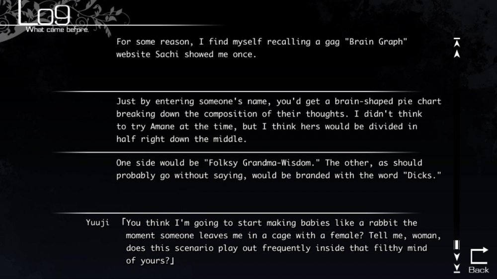 Harlequin Posted November 21, 2012 Posted November 21, 2012 I don't know if you started playing it already or how far into it you are, but a couple of pointers/recommendations if you will: - Do not even try to play this without using a walkthrough (seriously), in fact, use two: the text walkthrough and the walkthrough map. The map looks very daunting at first, but if you follow the text walkthough exactly and check the map as well, you'll make sense of how it all works in a short time and realize both are very useful from beginning to end. Also, yes, follow the text walkthrough exact order of routes and everything (the one(s) who wrote it claims there at the introduction that it is recommended for both better progress and story development/comprehension and i completely agree). - I don't even know if this game has the capacity to be run at full screen, but given it's age and resolution don't try it; would look pretty bad as opposed to nice and adequate in a window (though this may seem rather obvious i say it because some people can't into playing something in a window). - When you reach the second half of the game (incorrectly called by walkthroughs 'the epilogue') just hang in there, it gets quite, quite better later. That's it i think, if you have some questions feel free to ask as i still have it fresh in my head. Yes, got those two walkthroughs. At first I was gonna use the map only, but it doesn't seem to show a decent order of getting the endings, I think? But yes, using the text walkthrough with the map as support on the other hand should be nice. And yes, I've started reading, just a bit though. The map does makes sense already. Good point about the full screen. Yes, it looks quite a bit worse in full screen since the original window is really small. Normally I'd like to run it in full screen for the sake of immersion, since nothing else is on the screen as a distraction when you do. However, in this case, there's also the walkthrough thing to consider... I'd have to alt-tab a lot in order to check the walkthough if I played in full screen - that'll just get annoying over time. I'll be following the text walkthough to the letter after all, so better to have the game window right next to that. Thank you. Quote