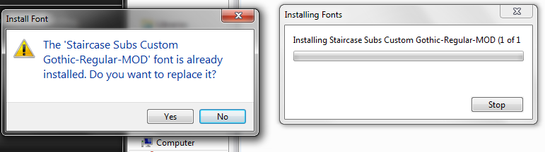 Karakkan Posted March 22, 2013 Posted March 22, 2013 See, that's one of the other issues I have. I thought I would just go into fonts, delete it, and then re-install it, but according to my search bar, nothing has the term "Staircase", "sub", or "custom". Yet, when I try to install the font I get from a 1.2 patch RAR file, it asks if I want to re-install it since it already exists, and nothing changes whether I choose yes or no. Could there be another folder it's installing itself to? - Pop up I get when trying to install the font. - Option menu now that I installed the font you linked. Note that the space between the rest and the one you got me to install, where the custom font should be. Quote