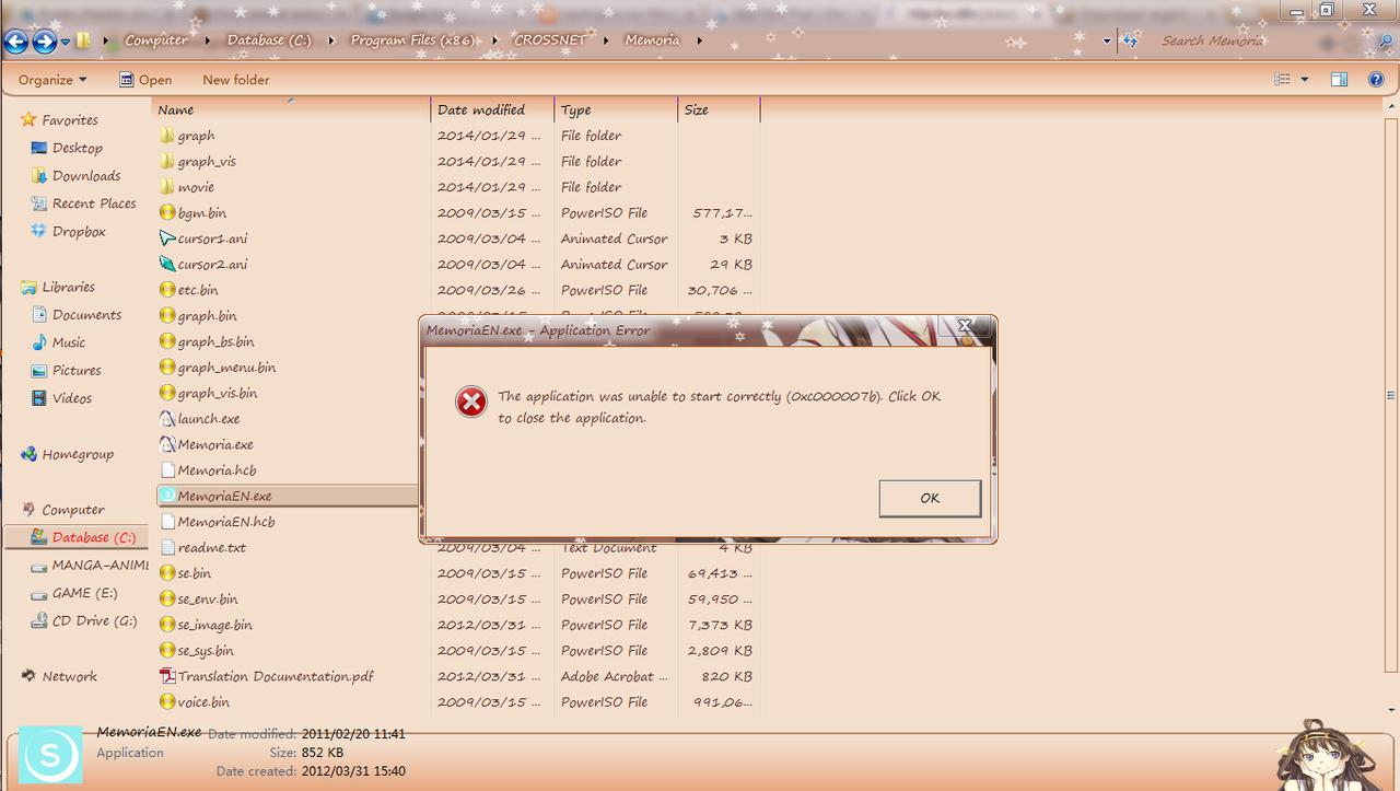 killerinsidee Posted January 29, 2014 Author Posted January 29, 2014 Can't really tell anything from the random error. Can you try and see if it happens with the raw game (without english patch applied) ?. Isolating or narrowing down the problem should be the first priority. Apart from that, you can try to re-install directx or maybe repair your registry with Malwarebytes or try 0xc000007b Error Repair Tool. Also make sure you have all of the needed Visual C++ runtimes installed. These are all just long shots, but they may fix it by some miracle. Quote