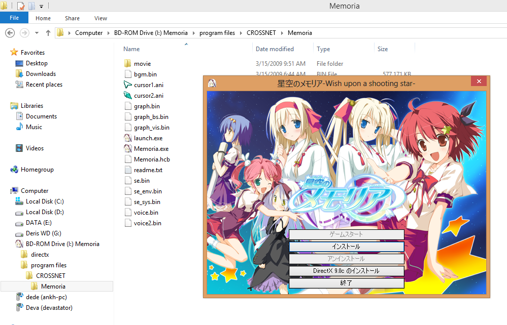 Dr_Iss Posted November 7, 2014 Posted November 7, 2014 errr,, i'm still newbie about visual novel and just finished my first VN Grisaia no Kajitsu without any problem with the installation... and i was following the installation Hoshizora no Memoria the same way as Grisaia with Daemon Tools then mount the file that i downloaded... after i clicked the icon for install at (:\Program Files\CROSSNET\Memoria), there's an installation window BUT the install option that i believe at the very top of the option can't be clicked.. Here is the picture that i prtscreen.. I wonder why the install button can't be clicked... I'll really apreciate it if you can help me.. Thanks.. Sorry if my english bad.. Quote