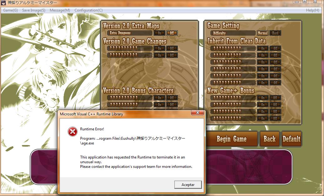 Lanselot Posted June 1, 2012 Posted June 1, 2012 Well, after struggling for quite a lot, I managed to install and patch (the 3 payches + english patch, which was always saying "Software Not Found" e_e). My problem is that, when I start the game, at the begining everything works. I can see the opening perfectly, and the start menu appears. But after doing a pair of clicks, not even being able to start a new game, this error appears: If I try to open again Age.exe, it asks me if I want to change my settings (in japanese, ofc). I have tried some random changes, but I keep getting the error. Any ideas? Quote