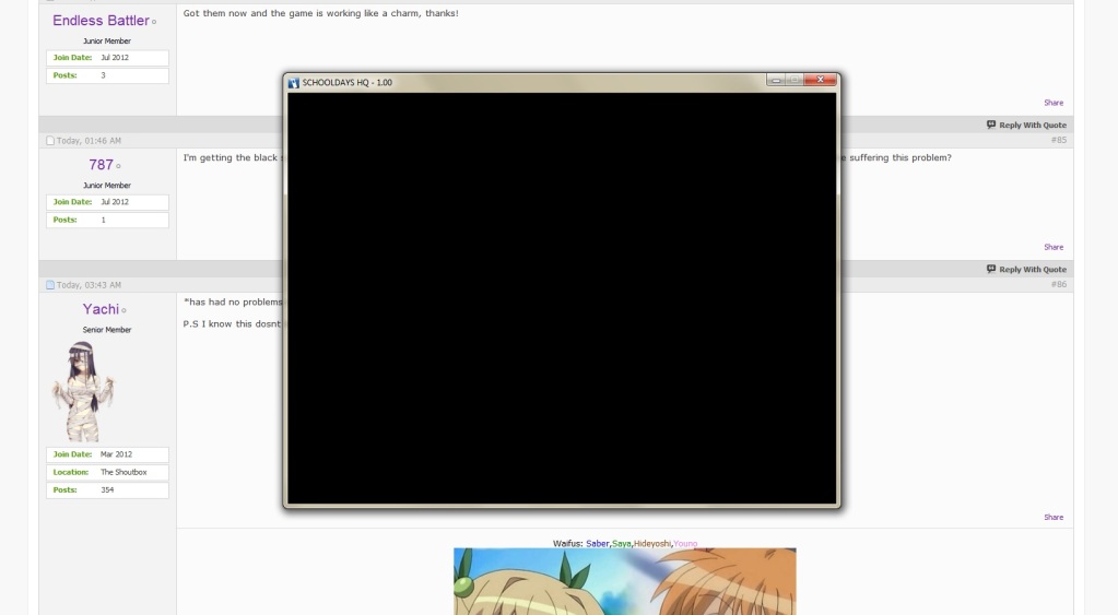 Linkman19 Posted July 13, 2012 Posted July 13, 2012 I have the issue where you get the black screen when opening School Days HQ but I have updated my graphics driver and it still doesn't work. Please help. Here is an image showing what happens Quote