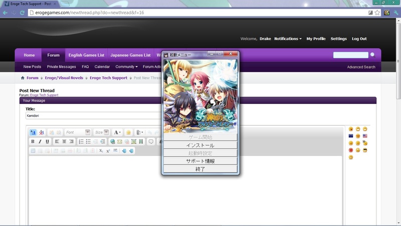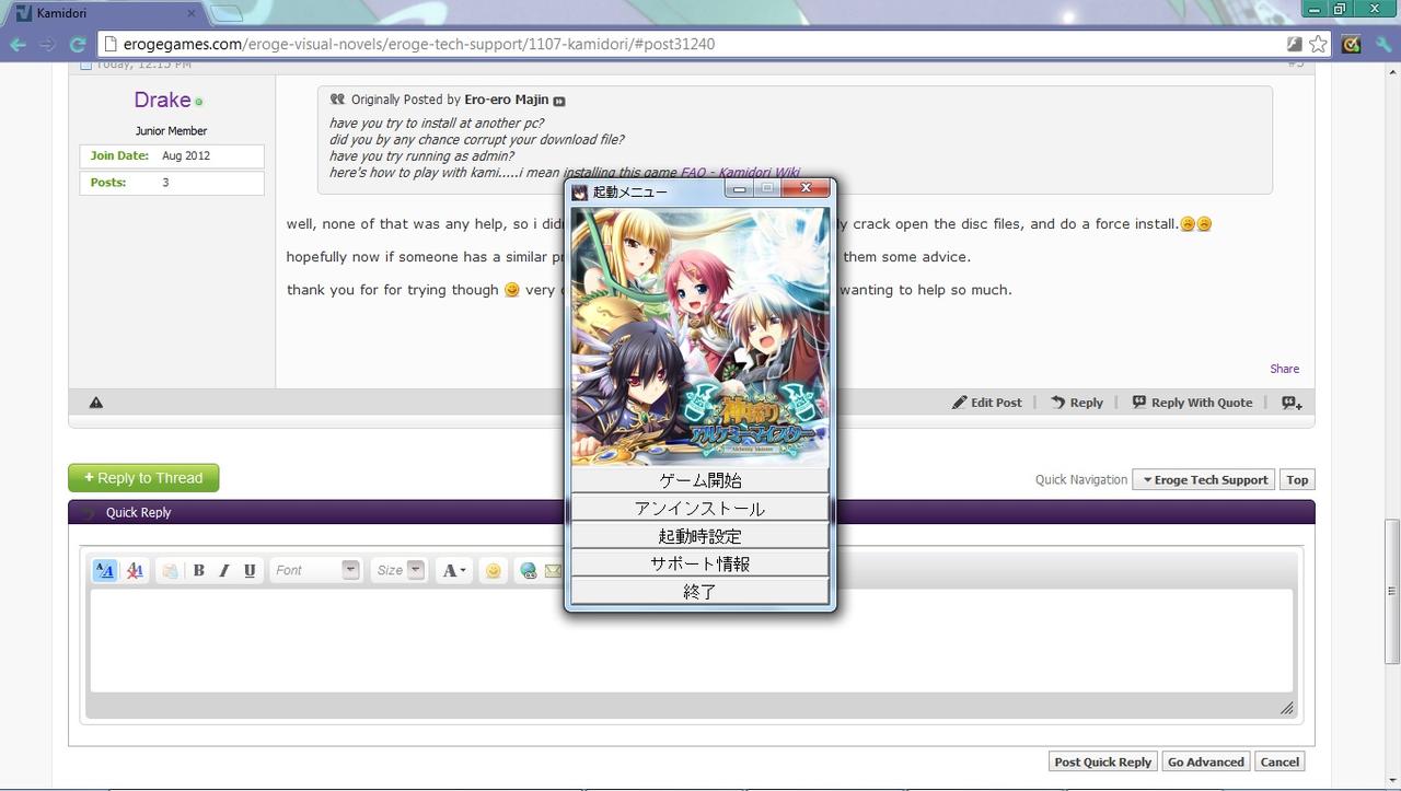 Drake Posted August 31, 2012 Author Posted August 31, 2012 Ero-ero Majin said: have you try to install at another pc? did you by any chance corrupt your download file? have you try running as admin? here's how to play with kami.....i mean installing this game FAQ - Kamidori Wiki well, none of that was any help, so i didn't want to do this, but i had to forcefully crack open the disc files, and do a force install. hopefully now if someone has a similar problem as me, i'll at least be able to give them some advice. thank you for for trying though very quick replies and it is nice seeing people wanting to help so much. *Edit* *After force install* Quote
