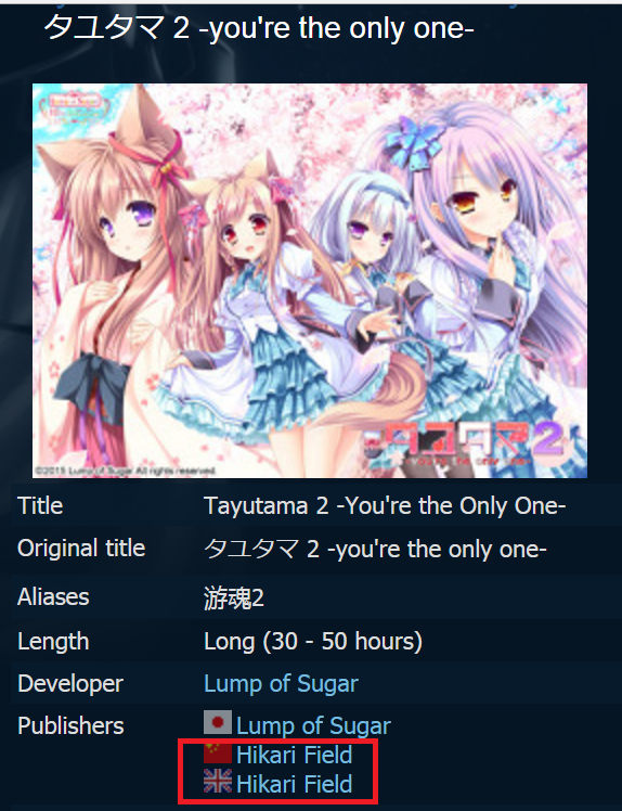 2. also, upon checking the vndb, for info about the translation team. i found out that the translation team is called "Hikari Field" the same one who translated this vn to chinese, is now translating it to english... [spoiler=screenshot of translation team in vndb] Their website is(unless i'm mistaken): HIKARI FIELD | www.hikarifield.com the site consists of chinese and japanese version which separates to below urls chinese: here japanese: here i am assuming they have contract with the vn developer "Lump of Sugar" since they are selling it to steam, from what i gathered from vndb.. it is the only vn they have translated so far.. i hope the translation team has some native english speakers in them or very proficient one.. i hope the team delivers... and also have plans in selling 18+ patch separately edit: their english site is : this