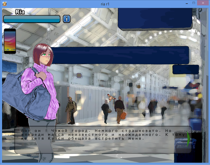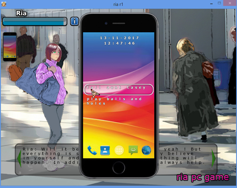 Ria PC game EN | RU platform: PC Windows genre: quest, mini games, love story, sci fi engine: fle game engine She was running. From difficulties and problems to luck and success. Her path was not easy. An alien city. Fear of suspense. Emptiness. Depression. Fatigue. She found the strength to look at the problems in person. Her spirit was stronger and higher. Failures are not broken. Although the path is thorny and tortuous. I believe she will achieve goals! This is Ria and her story. Full of surprises and unpredictable obstacles. Questions and search answers. Sorrow. But love. Wanderings, desperate struggle and unexpected finds. Good luck to you, Ria. This is ria pc game. Welcome ! This is the story of a girl named Ria. She came to a strange city. Studying at the University. New friends and acquaintances. Difficulties of getting used to a new place and new life. The truth is Aunt Casey and she is always ready to help. Ria will plunge into the whirlpool of a big city, big things, problems, but also great opportunities. Learn about yourself and your hidden abilities and talents. Forward! Towards conquering new peaks !! Excellent achievements! download ria pc game 22.11.2017