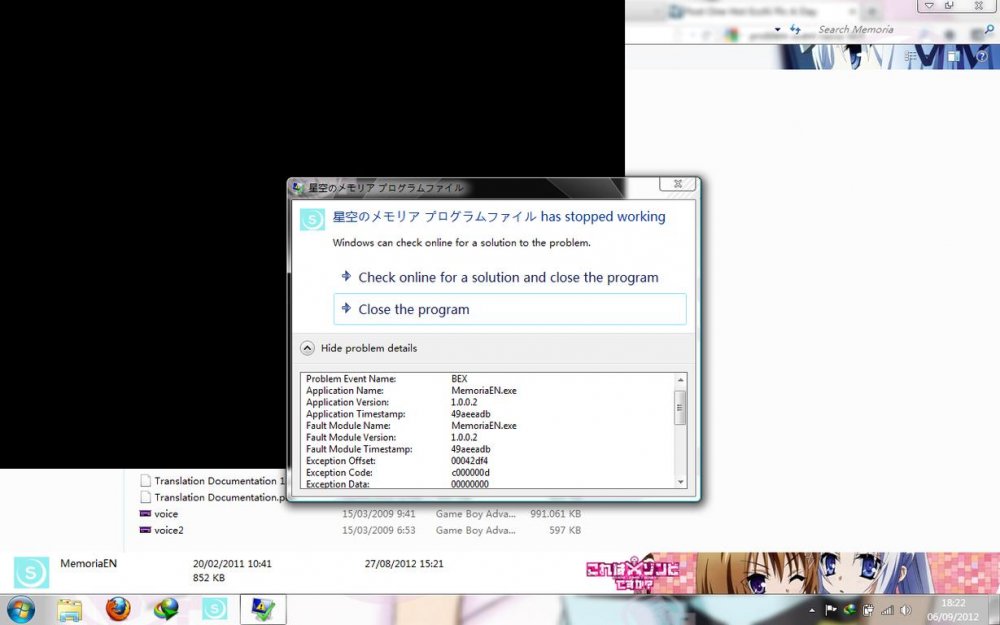 Someone help. When I play Dengeki Stryker everything just fine. But after haruna go and yamato not come to see her at the beginning of the game. But after the word "Time passed...... and so our story begin",After that everything is going black. But When i push ESC button there is option to quit the game. That means the game is still running,Then why there is only Black Screen. SOMEONE HELP ME