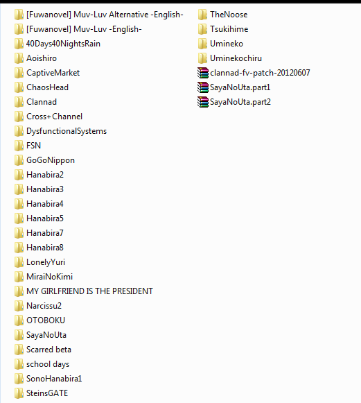 This is mine, upload a pic or list yours This is almost like a recommendation thread. What is your favorite out of all of them? Which ones you need to get around playing? Which ones do you own IRL? Are there any that you plan on buying soon? I need to play Clannad and FSN I need to finish My Girlfriend is the President My favorite is School Days *I get pushed off a bridge right now* I really want to buy the special edition Saya No Uta, Tick Tack, and My Girlfriend is the President. Not listed: Shuffle! Katawa Shoujo DeIz Dysfunctional Systems Tick Tack Demo Little Busters