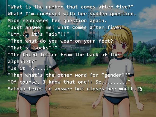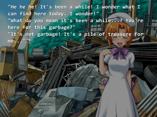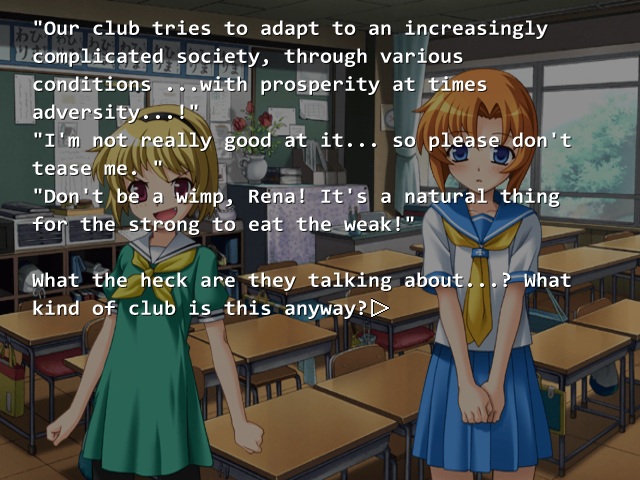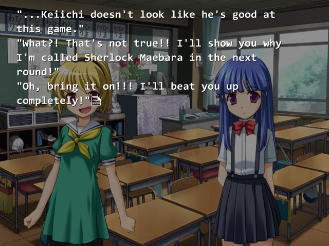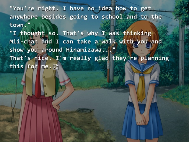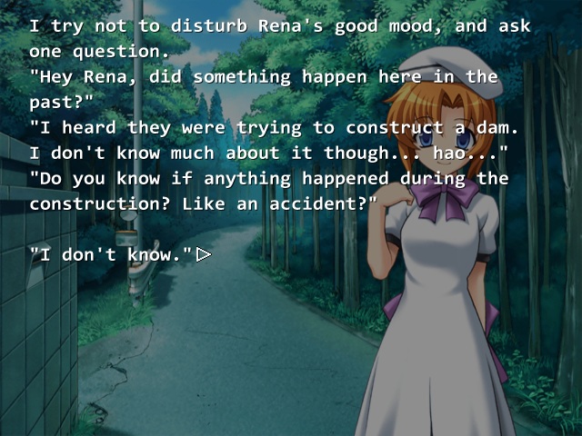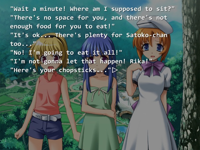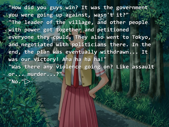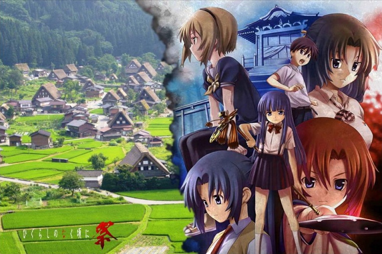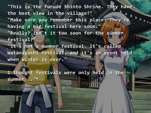 19. Higurashi no Naku Koro ni (+Kai)(Ni VNDB) (PS2) Opening movie: (Spoilers are all inside the spoiler box down at the bottom.) (Wall of text detected!) "Everything will be over... when the Higurashi cry." This will be a double review of sorts, involving both Higurashi no Naku Koro ni, which I will call "Ni", as well as Higurashi no Naku Koro ni Kai, which I will call "Kai". Ni is the first part of the Higurashi series, consisting of question arcs 1-4 (arc = chapter/story, more or less), while Kai is the second part consisting of answer arcs 5-8. I will call the series in its entirety "Higurashi". Simple! I would like to preface all of this by saying that I read Higurashi with all available patches for it installed. As such, this review will naturally be based on my experience with those patches being active. What all those patches do: replaces sprites and some backgrounds with the ones from the PS2 version, new text font, hides the interface menu buttons, brings back most of the music + sound effects that was removed/replaced in the MangaGamer version. By far the most important patches are the music and sound related ones, which I would recommend everyone to use. I'll explain why further down below in the "Sound/VA/Music" area. Also, I highly recommend reading Higurashi with the typical horror setup; in the dark, alone, at night, with headphones (high volume), and with fullscreen mode on. Good immersion makes a tremendously positive difference, especially so for Ni. I can attest to that, hehe. With that out of the way, let me tell you what Higurashi is all about! Higurashi is a mystery thriller sound novel series. Yes, sound novel, because the music and sound effects majorly sets the tone of every scene for the reader, not so much the visuals. (I'll still call it a VN though, for simplicity's sake) The experience is certainly different compared to other VNs because of this. Your imagination becomes a much more important tool, not to mention your love for reading a great story in general. What is the story of Higurashi? Well, here's a basic version of its overview, which I did not write myself: "Higurashi no Naku Koro ni takes place during June 1983, at a fictional rural village called Hinamizawa. The main character, Maebara Keiichi, moves to Hinamizawa and befriends his new classmates, Ryuuguu Rena, Sonozaki Mion, Furude Rika, and Houjou Satoko. Keiichi joins their after-school club activities, which consist mostly of card and board games (and punishment games for the loser, usually him.) Hinamizawa appears to be a normal, peaceful, rural village to Keiichi. However, the tranquility abruptly ends after the annual Watanagashi Festival, a celebration to commemorate and give thanks to the local god, Oyashiro-sama. Keiichi learns that every year for the past four years, one person has been murdered and another has gone missing on the day of the Watanagashi Festival. Keiichi himself soon becomes drawn into the strange events surrounding the Watanagashi Festival and Oyashiro-sama." So, it's about a group of friends and the ominous mysteries that surround the seemingly peaceful and happy environment in which they live. Something very, very strange is going on. Again, that is as basic as you can get. But that's good. The less you know, the better. Simple information is all you should have before starting to read it, because I can promise you that it will be way more fun if you don't know too much about it beforehand. That's exactly how it was for me. In any case, Higurashi is magnificent when it comes to that pure mystery feeling. Not only that, it is also frequently worrying, tense and creepy, making you extremely paranoid about what's going on. These two traits, mystery and suspense, combines into what I like seeing in a VN the absolute most. And yes, Higurashi does it incredibly well, which is one of the reasons why I like it so much of course. You just can't stop thinking about the vast amount of well-crafted mysteries and problems that this brilliant story presents to you. Based on what I've said so far, it probably sounds like Higurashi is all about the ominous mysteries and not much more. But that's not true at all. Trust me... there are many things about Higurashi that ultimately makes it a masterpiece. There are so many different feelings that you get from it at different times in all the eight arcs. For one, friendship plays a huge role in the story. There's plenty of light-hearted comedy and happy times to be had. It's not always "seriousface", and yes that's a good thing. You truly connect with the characters to a great extent over time, as well as get a sense of belonging in the setting in which the story takes place. Also, there's plenty of very emotional and tear-inducing scenes to be found in it, plus empowering ones that are just simply epic. And of course, many, many "What The Hell Is Going On?" moments. Higurashi has a bit of everything. Oh, can't forget: Higurashi as a whole (arcs 1-8) is incredibly long. It took me over a hundred hours to get through, easily. This is a good thing though, because it means that the story can be very detailed and allows for great character development. It's a big plus for me personally. Now for some more specific tidbits about this awesome mystery VN! Visuals/Art - Not exactly an important part of Higurashi. The original PC novels were made so that music and sound effects would take precedence over visuals. You do have backgrounds and sprites, so sure, they can definitely strengthen the effect of certain scenes (...). In fact, I really like the PS2 sprites myself. They've got a pretty cute art style to them. The backgrounds are kinda nice too. CGs? There are none in the original novels. However, if you use the PS2 sprite+background patch...well, who knows. One thing I should tell you about is the text speed. Yes. The text speed itself can heighten the impact of a moment. Because you see, the speed of the text in Higurashi is not the same cons