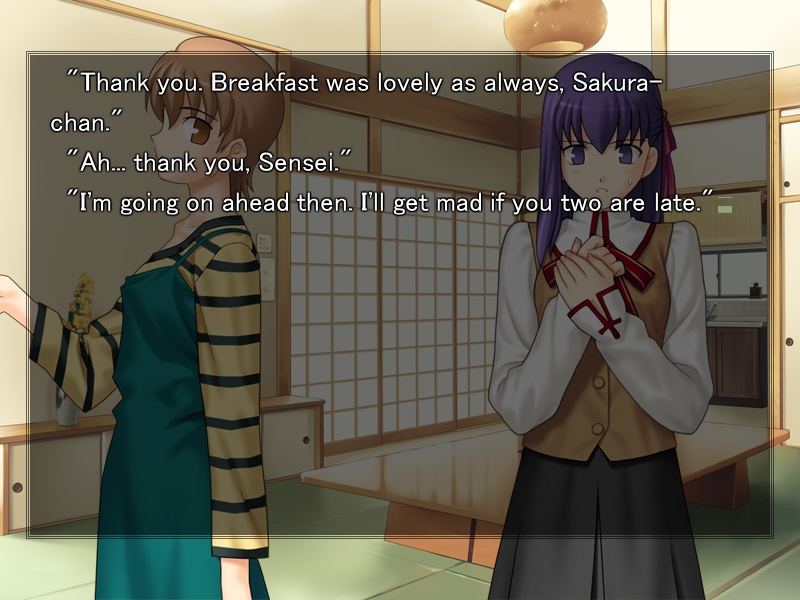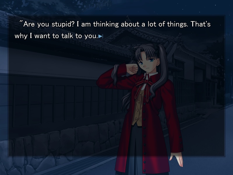 Fate/stay night (VNDB) Opening movie (1): (Spoilers are all inside the spoiler box down at the bottom.) "Rejoice, Emiya Shirou. Your wish will finally come true." Good lord... This was an epic journey. But that's obvious right? It should be. I knew it would take a long time to finish before starting. But really, it was longer than expected. It was atleast as long as the entire Muv-Luv series. Yes, it was quite exhausting to say the least. Exhausting but oh so good. Let's just get this out of the way right now: This is an incredibly entertaining VN. One of the best you can find, no doubt. I was very addicted to reading it. Plain and simple, it had a thrilling and intense story that I just wanted to see more and more of. So, the specifics for the brilliant Fate/stay night then. Visuals/Art - Before starting to read it, I thought that the sprite art would put me off somewhat. It doesn't really look like what I'm used to. But of course, even if it's different from what one is used to, it doesn't mean it can't be good. It definately was good in the end. The CG art on the other hand is more than just good - it's great. Also, one different thing worth mentioning is the way the text presents itself. It appears in the middle in a transparent grey box which more or less covers the entirety of the screen. This is certainly different from most VNs... But it works. I liked it, but I'm not sure for what reason. Does it make it feel more like reading a normal novel? And if so, would that be a good thing? Does it make the text appear more "powerful"? I'm not sure, I just know it works really well. One more thing - the menu system. It looks great, it works well, and there are some parts of it that shows you fun information about certain characters and weapons. Really nice and impressive. Sound/VA/Music - Fantastic all-around. Voice actors did a good job here, to say the least. Very memorable. If I had to comment on some voice in particular then it would have to be the voice of Kotomine Kirei. It's seriously great. Really dark, intelligent and powerful sounding. There's a good chance you'll appreciate it a lot aswell. I guess one more voice worth mentioning would be Rider's. Very appropriate for the character. It's dark, gorgeous and sultry, and you just want to hear more of it. When it comes to music, there's plenty of great songs in there of course. The kind of songs you want to listen to on Youtube even after you're done reading the VN. One song in particular stuck with me for being absolutely perfect in a certain moment of the VN. I won't link it here because it's spoilerish, so it'll go to the spoiler box down at the bottom. Characters - Easily the best part of Fate/stay night for me. I love these characters. There are many of them and they all differ from each other a lot. "Cool" is the right word. They are cool. The weapons, the skills, the personalities, the looks, the voices, I love it all. You'll remember these characters long after you're done with the VN. And yes I do have some favourites, though I'll talk about those in the spoiler box. Yes, it's very easy indeed to have several favourite characters in this VN, because there are just so many good ones in it. The protagonist, Emiya Shirou, is not the best but still good enough. He's got nothing on the likes of Kenichi from Sharin no Kuni. Unfortunate but also expected. Still, that's just a personal opinion really. Some will like him, some will not. His personality and way of doings things are key however to the story itself, so even though he's not the best protagonist you can find, he works well with the story presented in Fate/stay night. And again, I must mention Kotomine Kirei. He's an amazing character overall. You'll think so too after you've read Fate/stay night. Plot/Story - Something epic. Dark, thrilling, mystical, intense, intriguing. There's a ton of entertainment to be had with this plot. I always wanted to see what happens next in it. It was an addictive story that I'm going to miss a lot. There are many twists and turns going on that will make you think and wonder about what will happen next. There are three routes in total. Fate, Unlimited Blade Works and Heaven's Feel. Fate serves somewhat as an introduction to what Fate/stay night is about. It does a fine job with it too, but ultimately it could still have been better in general. After Fate you then have Unlimited Blade Works aswell as Heaven's Feel where the story gets to a whole new level of awesome. There's plenty of special moments in all the routes, even Fate, that sticks with you. All three routes together will take you a long time to finish, but you should see that as a good thing really, because this VN is so damn fun to read The tiger dojos deserves an honorable mention also. It was fun to get the large amount of bad endings because of them. They break up the seriousness of the bad endings with something lighthearted so it's easy to keep going afterwards. You will like them, there's no doubt about that. Screenshots (click the thumbnails) - Final words - I had a lot of fun with this, to say the least. It's one of those titles that made me realise just how happy I am to have found and taken a liking to reading visual novels. To a certain extent, Fate/stay night aswell as Muv-Luv Alternative made me also realise how much better and more fun a VN can be than your typical game. The storytelling in this is just so great and entertaining, not to mention all the other "small details", like the brilliant soundtrack and the very memorable characters. So yes, this is one of those must read VNs for someone who can enjoy them in general. However, I will say this again: This is a really long read. So that's something to keep in mind. Still, I'd say that's just a positive in the end. It's a long and entertaining story, well worth all that time. It's easy to understand and as such it shouldn't be missed by anyone at all. Of course, if you happen to like what this VN is about specifi