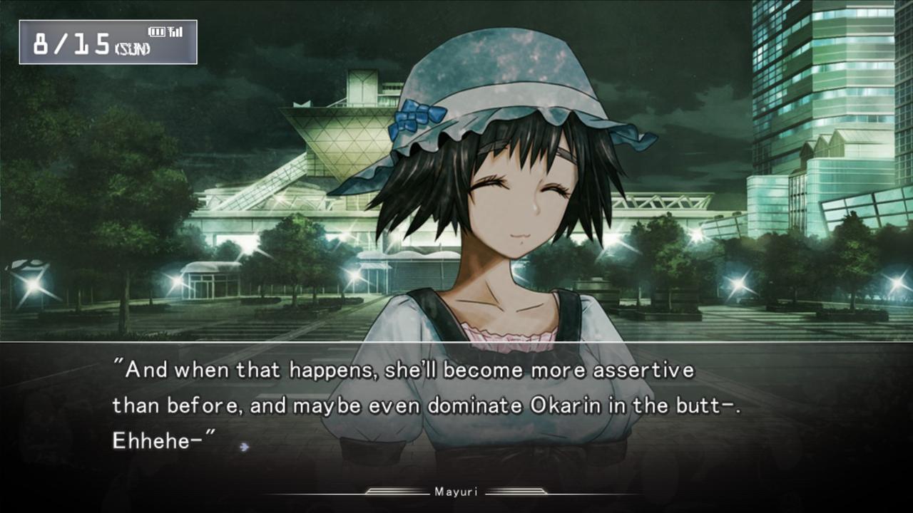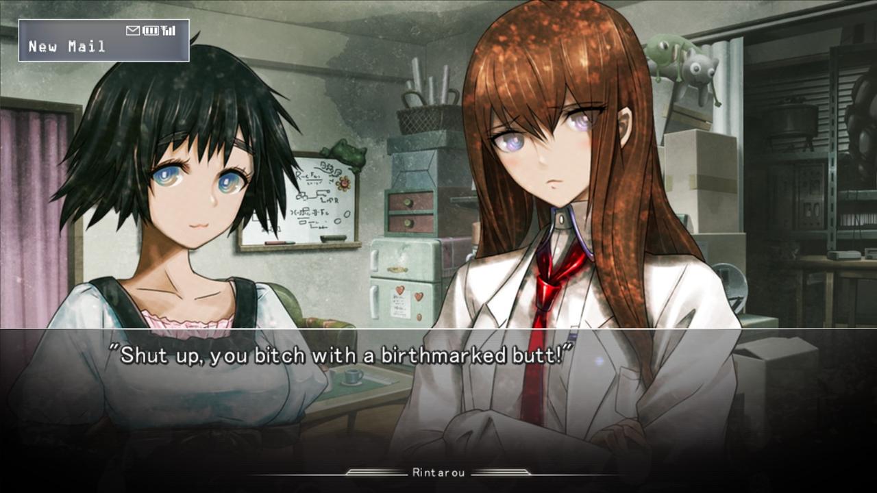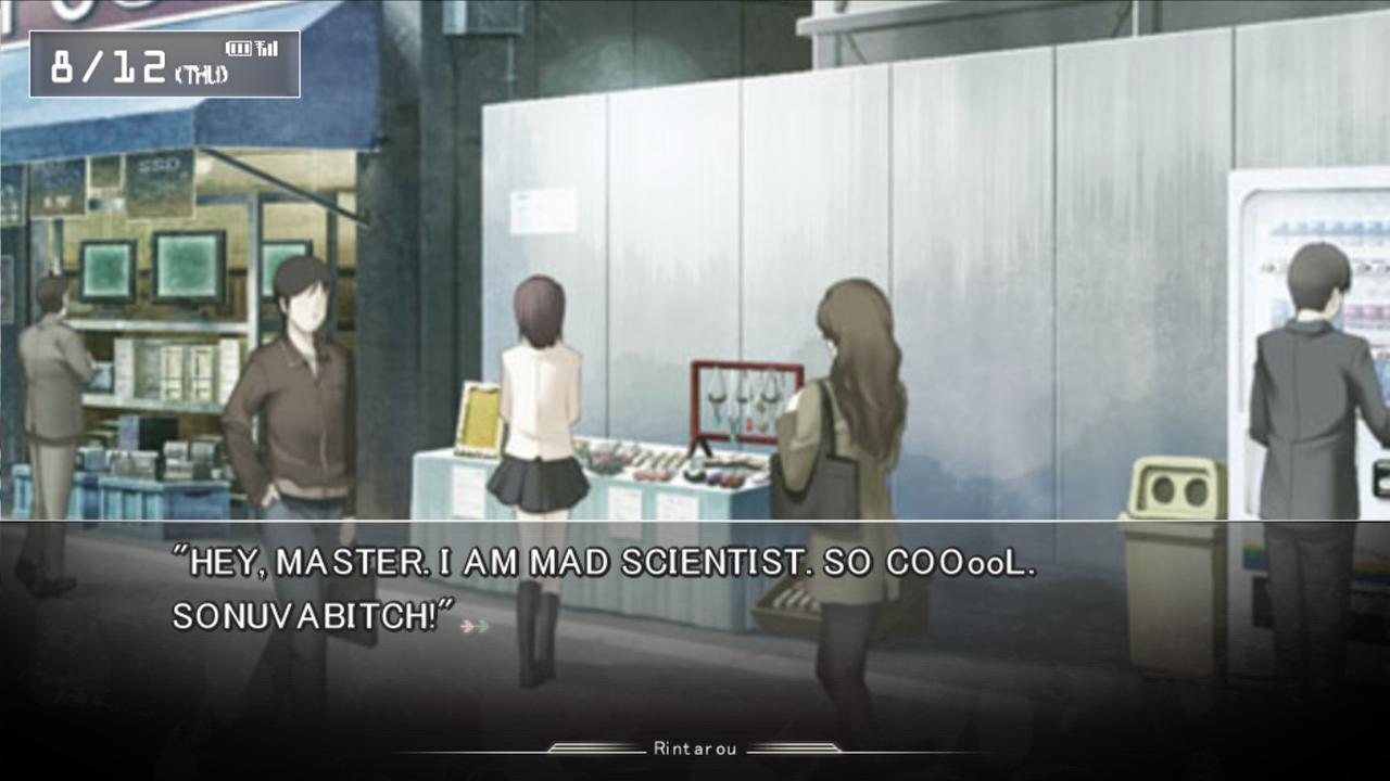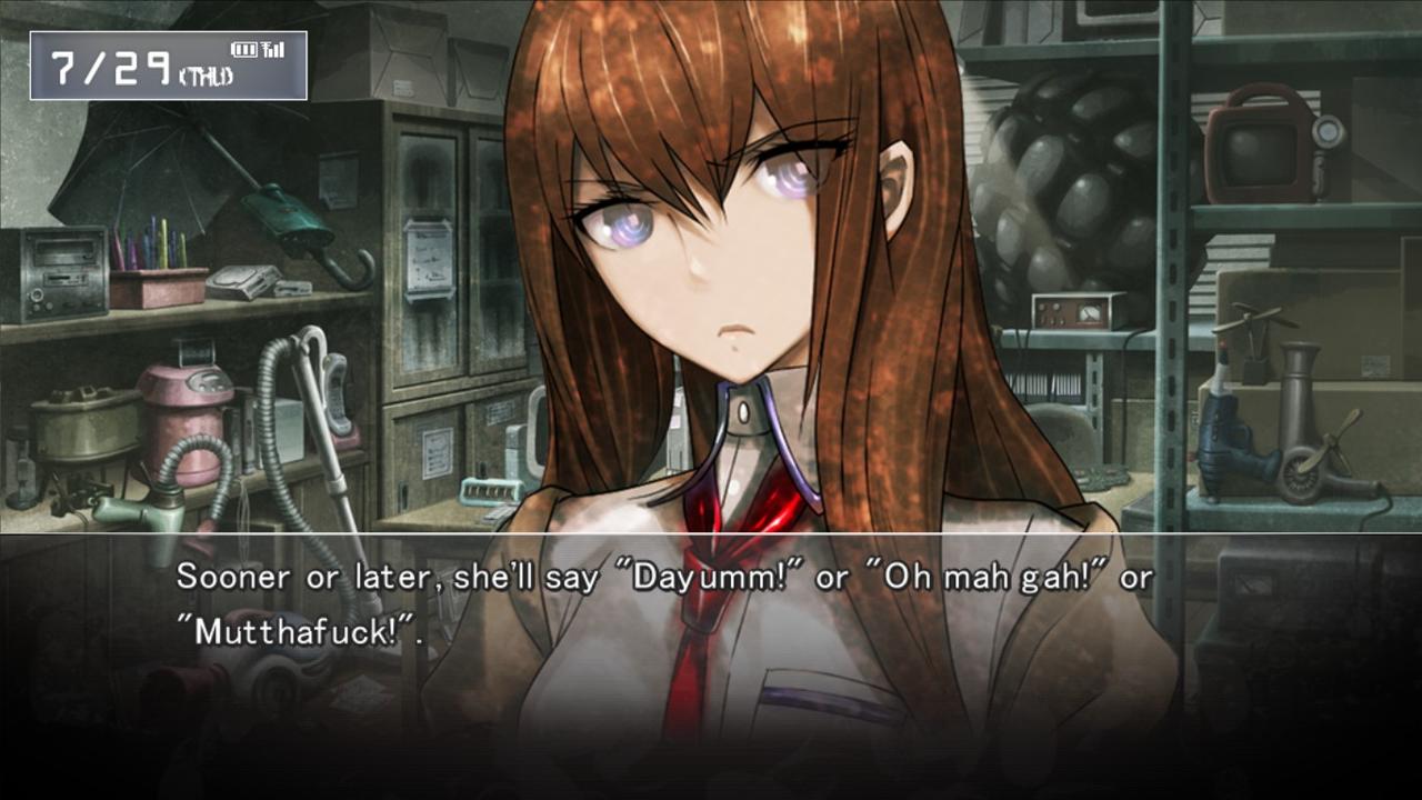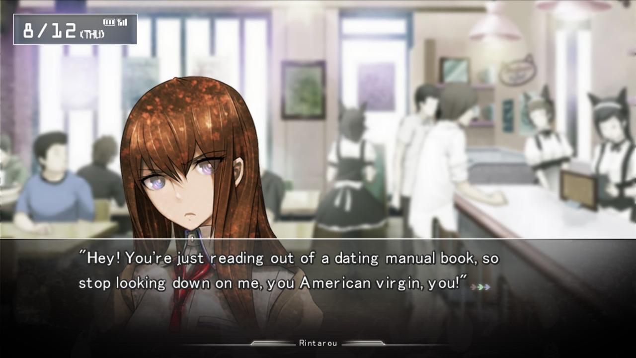 I never really take screenshots when i play VNs but last month i though i should try to while playing Chaos;Head. Unfortunately i was so focused on the story that i forgot But anyway, now i'm playing Steins;Gate and i didn't forget to take some: -tan? Okabe may have a problem with stereotypes about americans. Note: ANYTHING both Okabe Rintarou and Mayuri say is ten times funnier if you can actually hear their voices. I'll be honest, she scared the crap outta me the first time she said this (If you haven't played this game, you can basically check your cellphone at almost anytime. But apparently Cristina doesn't like being ignored).