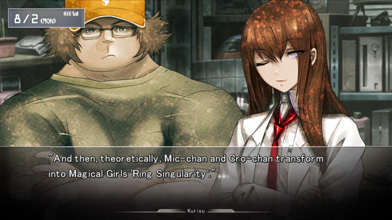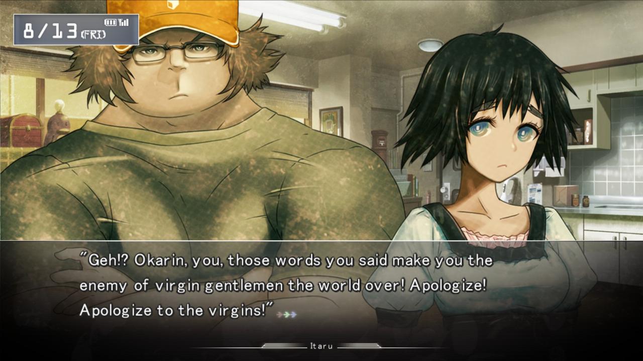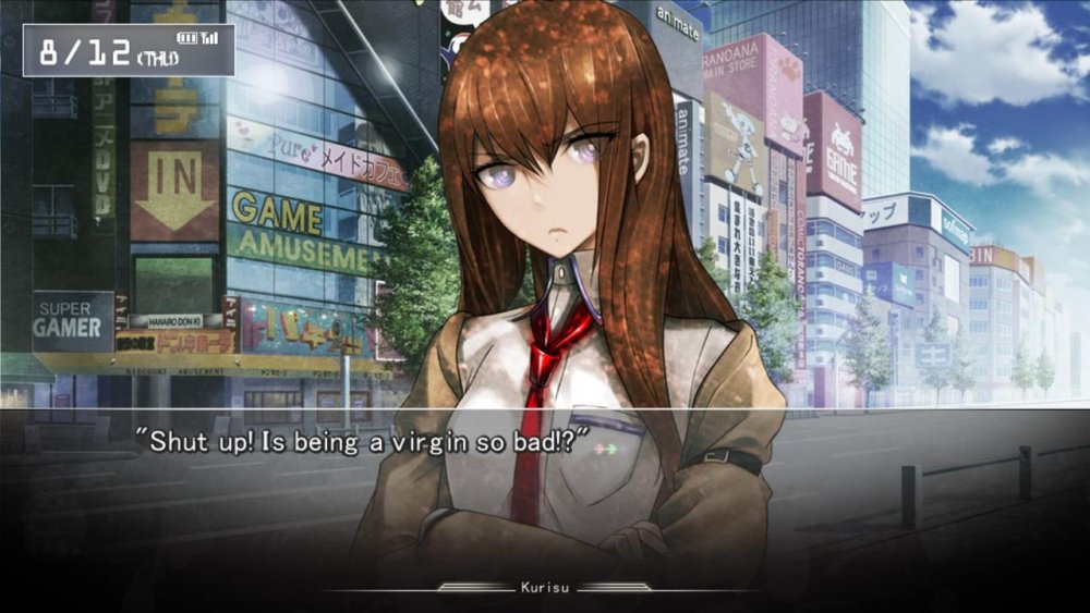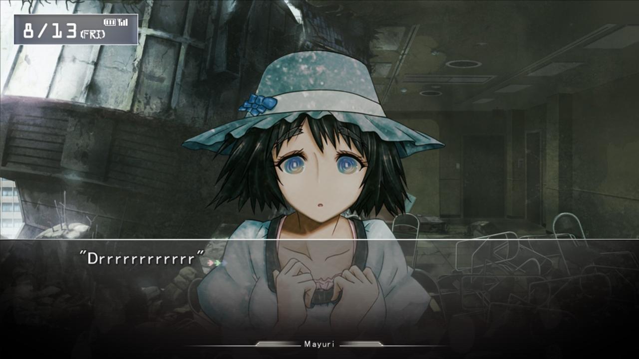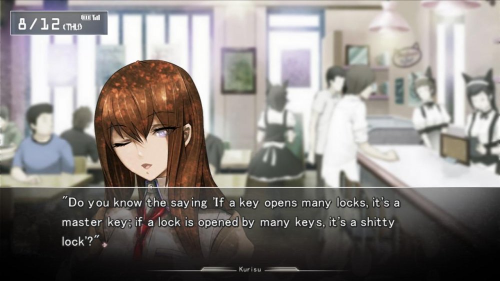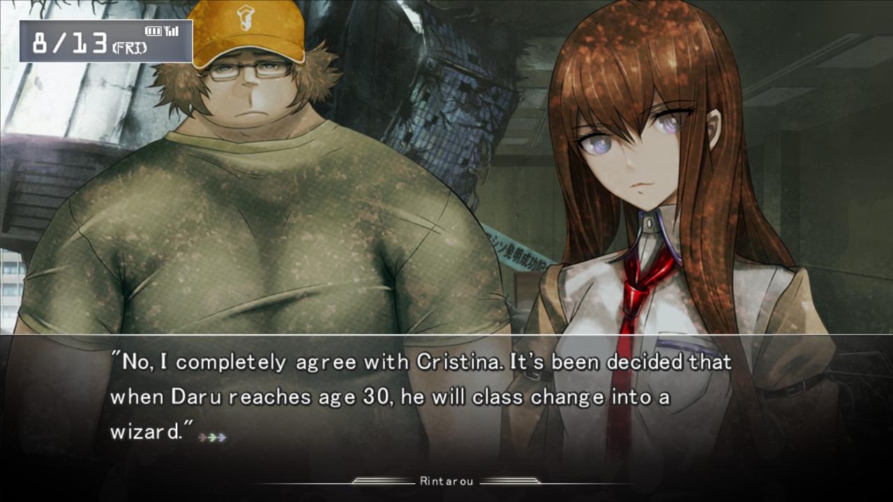 I never really take screenshots when i play VNs but last month i though i should try to while playing Chaos;Head. Unfortunately i was so focused on the story that i forgot But anyway, now i'm playing Steins;Gate and i didn't forget to take some: -tan? Okabe may have a problem with stereotypes about americans. Note: ANYTHING both Okabe Rintarou and Mayuri say is ten times funnier if you can actually hear their voices. I'll be honest, she scared the crap outta me the first time she said this (If you haven't played this game, you can basically check your cellphone at almost anytime. But apparently Cristina doesn't like being ignored).