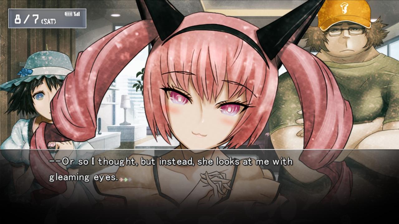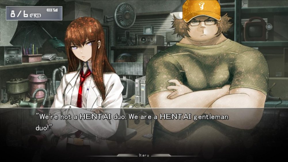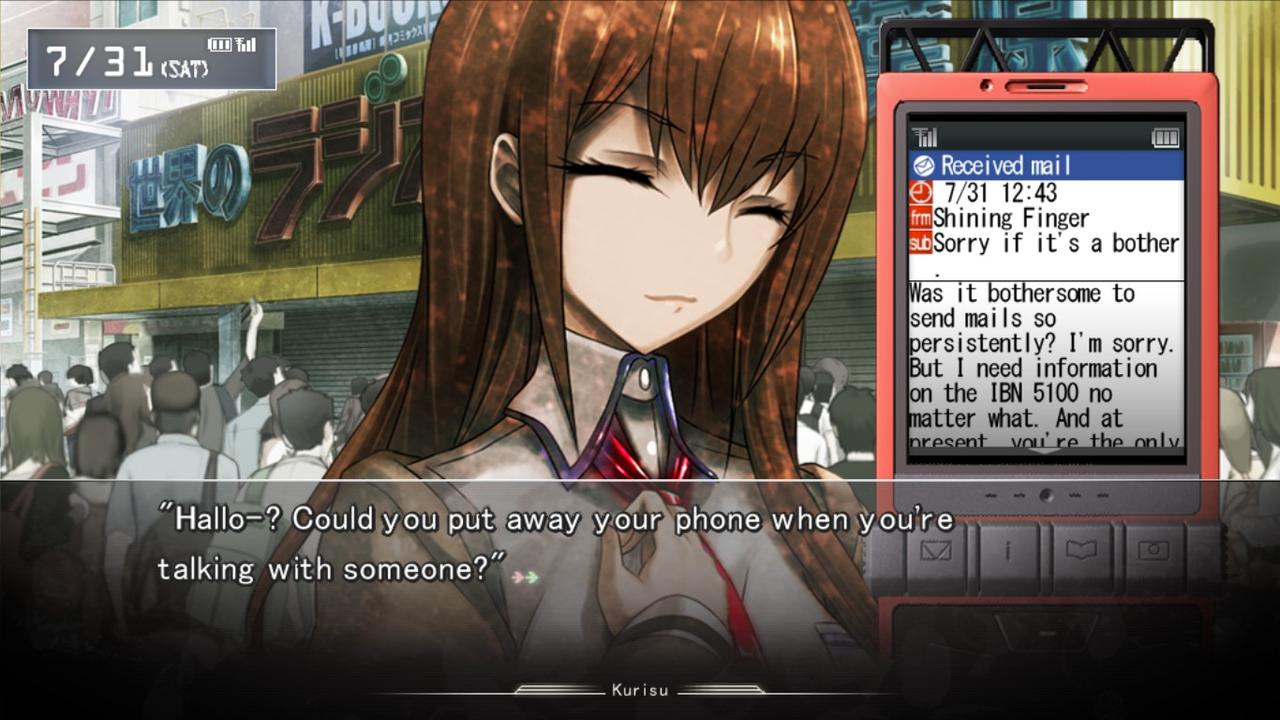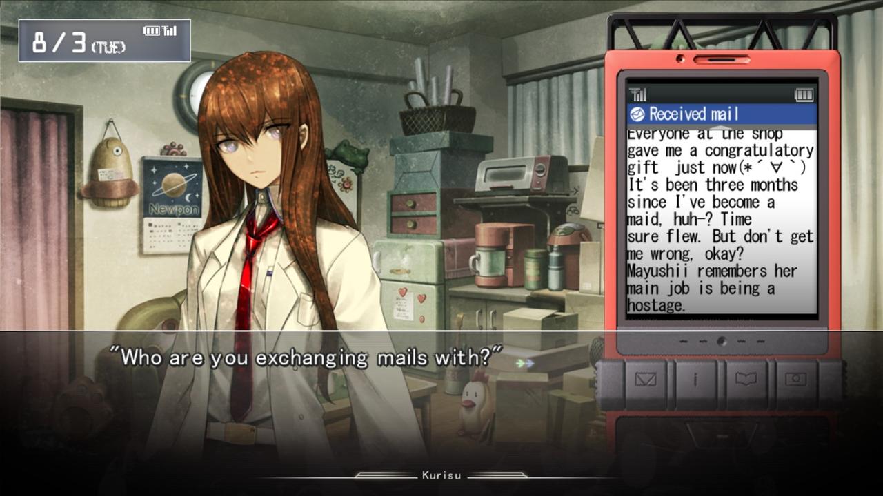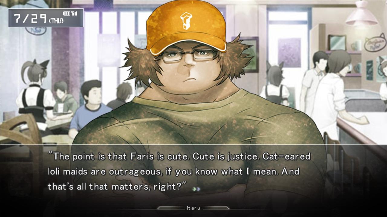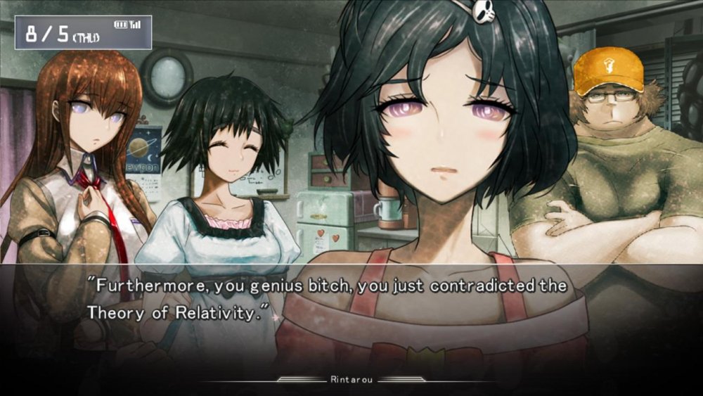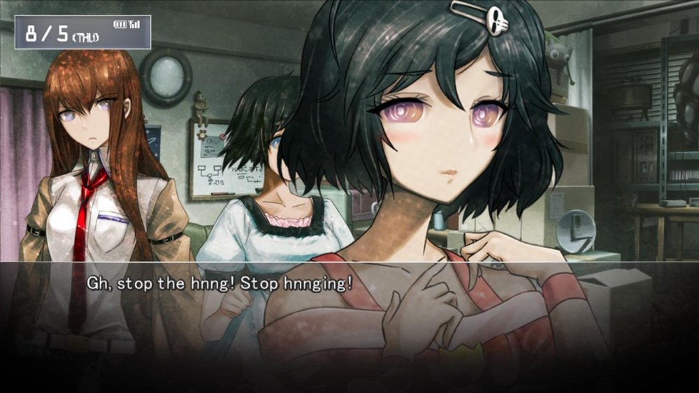 I never really take screenshots when i play VNs but last month i though i should try to while playing Chaos;Head. Unfortunately i was so focused on the story that i forgot But anyway, now i'm playing Steins;Gate and i didn't forget to take some: -tan? Okabe may have a problem with stereotypes about americans. Note: ANYTHING both Okabe Rintarou and Mayuri say is ten times funnier if you can actually hear their voices. I'll be honest, she scared the crap outta me the first time she said this (If you haven't played this game, you can basically check your cellphone at almost anytime. But apparently Cristina doesn't like being ignored).