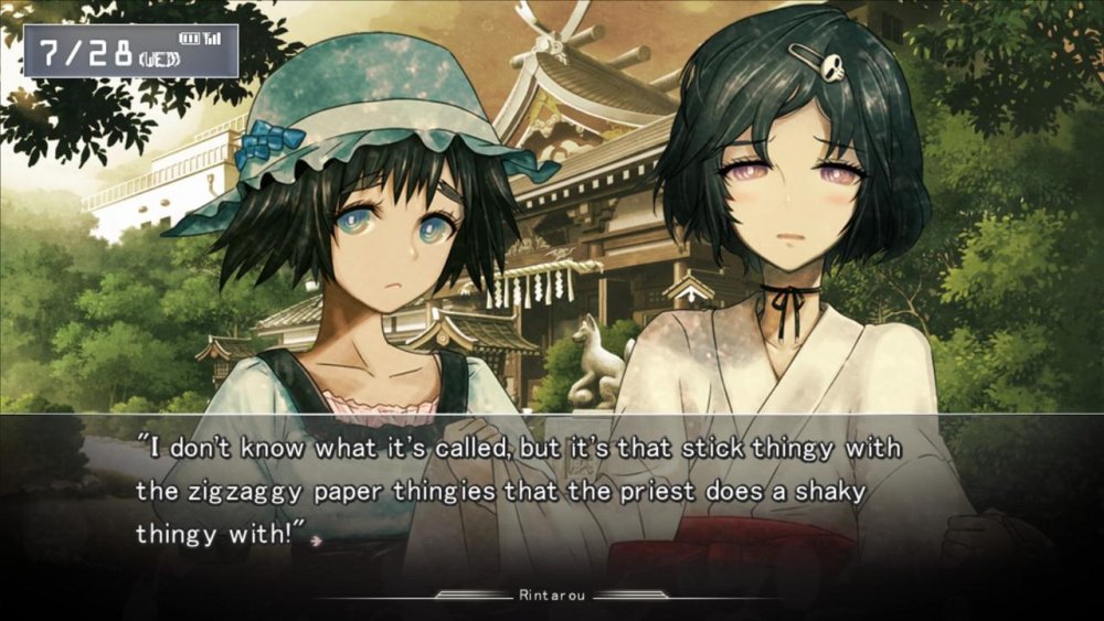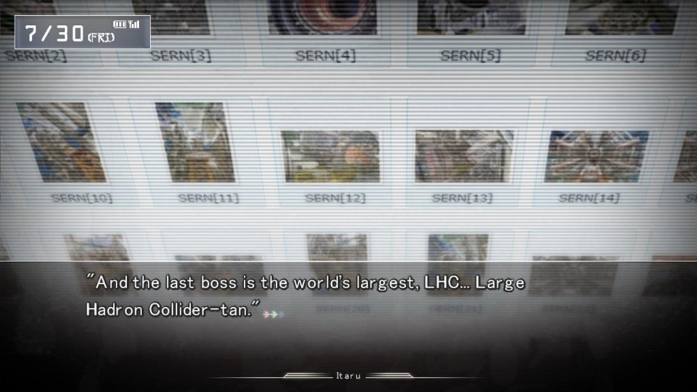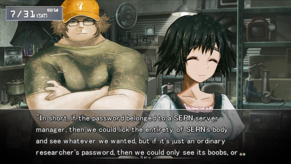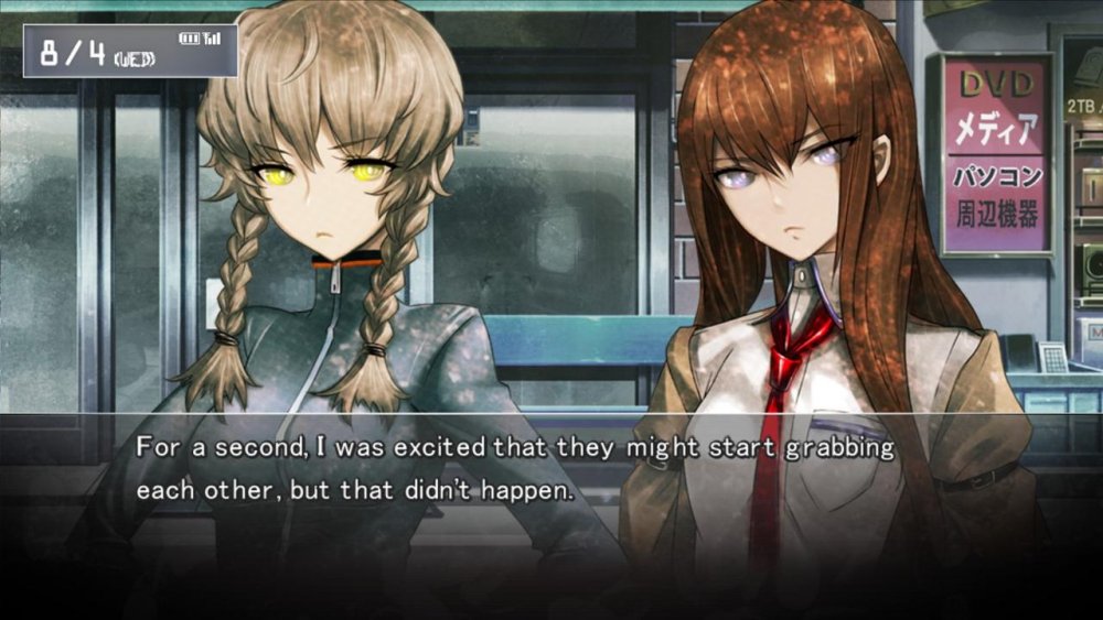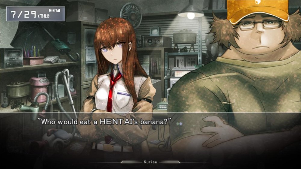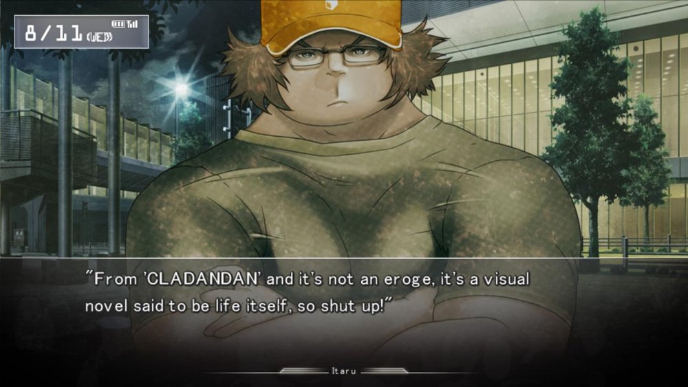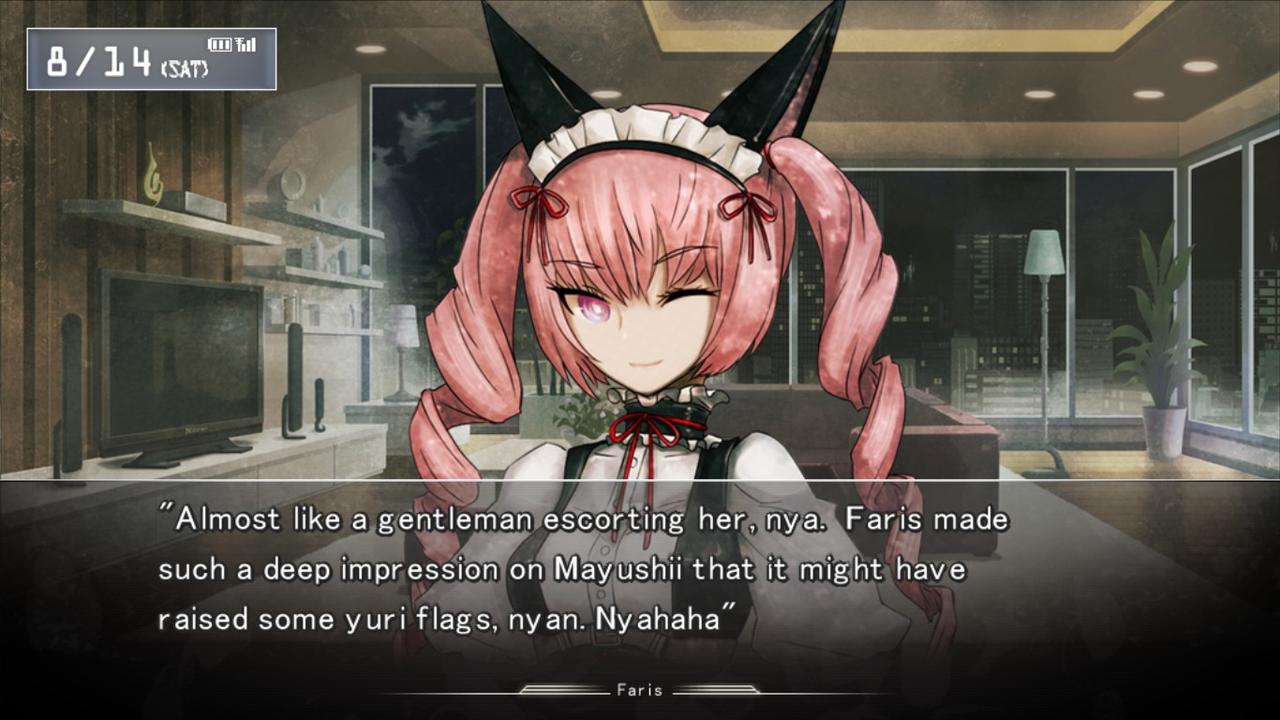 I never really take screenshots when i play VNs but last month i though i should try to while playing Chaos;Head. Unfortunately i was so focused on the story that i forgot But anyway, now i'm playing Steins;Gate and i didn't forget to take some: -tan? Okabe may have a problem with stereotypes about americans. Note: ANYTHING both Okabe Rintarou and Mayuri say is ten times funnier if you can actually hear their voices. I'll be honest, she scared the crap outta me the first time she said this (If you haven't played this game, you can basically check your cellphone at almost anytime. But apparently Cristina doesn't like being ignored).