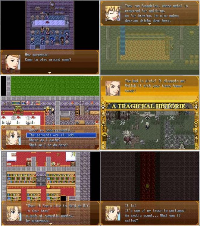 Game 28: Embric of Wulfhammer's Castle http://i.imgur.com/5t5xbFm.png Embric of Wulfhammer’s Castle is a fantasy RPG with an uncommon focus on the relationships between adventurers and the people who have to live with them, with only a fraction of the combat. The Duchess of the fair land of Elstwhere comes by carriage to the Marque of Wulfhammer, presumably to marry its lord, Embric of Wulfhammer. Embric, however, is nowhere to be found. The Duchess, not being the sort to sit around idly, embarks on her own quest to get to know the body of the eccentric populace of Castle Wulfhammer, among them the ladies and dwarves of the Awesome Fellowship, those rescued on the Fellowship‘s grand adventures, a bevy of mysterious townsfolk, monsters, nobles, demons and devils, waitresses, clerks, clerics and more. But there is something strange about this castle and its people. As the mysteries begin to unravel, and the real lives and futures of the people of Wulfhammer come into question, who can rescue those who are so used to doing the rescuing? Note: When you get the credits, do not quit. There is some time loop thing going on that isn't made clear at first. The game has close to 20 endings and most of them must be unlocked first by doing other endings or quests unlocked by earlier "endings", it will suggest that you continue the game, you should select agreed when it does. Download: Downloads « Embric of Wulfhammer's Castle - Home of the Duchess of Elstwhere