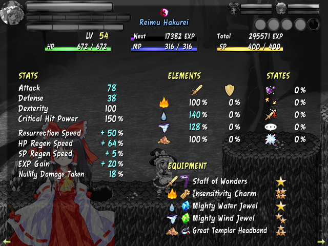 Game 21: Touhou - Wandering Souls http://i.imgur.com/d3wwUzq.png Wandering Souls is a fan game based on Touhou Project. Since this game focuses way more on gameplay than story, you don't necessarily need to know anything about the Touhou universe to enjoy it. Features: - More than 30 hours of nonstop action. - Original gameplay that mixes genres (A-RPG, beat 'em up, platformer, danmaku), fully programmed in the Ruby language. - A dynamic and fluid battle system with lots of available actions. - 12 playable characters, each with unique attacks. - Evolving weapons and accessories. - 3 difficulty modes so that any type of gamer can enjoy the game. - Fully customizable controls and joystick compatibility. Game Download: Touhou - Wandering Souls Downloads :: rpgmaker.net
