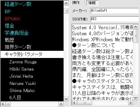 If you ever thought about something like this you most probably played Daibanchou or Rance. To be honest i have no idea if there is trainer for this or that game but i can help you cheat the game with this walkthrough. First we need a program that can edit memory tables inside of the game. Download program called SpoilerAL u can download it here Next thing on the list to do is download game tables for the program, u can get them here. !WARNING!THIS IS NOT MY LINK I WOULD BE GLAD IF SOMEONE REUPLOADED IT AND POSTED LINK SO I COULD UPDATE IT. Extract this SSG.7z into ssg folder inside of SpoilerAL. Start up the game(yes game has to be already working before u start up the program) load game, and minimize it. Now start up SpoilerAL(u need applocale so that it would work correctly). Time for a shock, yeah program is in japanese. No we wont translate this, yes you are going to have some nice fun with guessing whats what. I will be honest with you guys those images im adding as attachments arent mine so dont hit me, but i will try to tell u what and how. On those images u can see that this person is trying to cheat Daibanchou(i tried it too and it worked perfectly) Let's start with snap711 , first we need to change sorting so that it would sort by program.exe then on the left we choose name of the process, in order to learn it just press ctl+alt+del. For Daibanchou its system40 after that on the bigges screen there u choose the name of the game the one highlighted is of course Daibanchou, click nr 4. You noticed something? Yeah, we just entered the main hacking screen(there are 2 only one is important for us u can see on images which one).In Daibanchou u can have problem in only 2 things BP and fights, on snap714 u can see a big BP in blue, dont use it untill phase where u actually use BP(it doesnt work properly before that).As for fights u need to click LMB on those Japanese words that are white highlited on that screen, this opens all of your characters, choose the one you are interested in upgrading and click it.Oh sh*t lots of japanese words and bushes, which one is which eh ? Look at snap716 if u want to have strongest character ever just click one by one everything from that pink on top of the image(but not pink)and max it!WARNING u need to have that 16changed into 10(its blue on screen).Statistic wont change immediately, easiest way for them to change when u want is to enter item/inventory screen and exit it. Thats about it folks, with this kind of tips u can cheat any japanese strategy game ,that is if u use your brain.